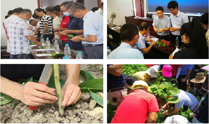 室内专题培训结束后,汪加魏老师和朱仲龙博士带领各学员到砧木苗圃地开展了嫁接技术实训,对红花玉兰嫁接的削接穗和砧木、嫁接膜缠绕等关键技术细节进行“手把手”教学。本期培训班为红花玉兰‘娇红1号’栽培推广与示范提供了重要的苗木繁育技术支撑。