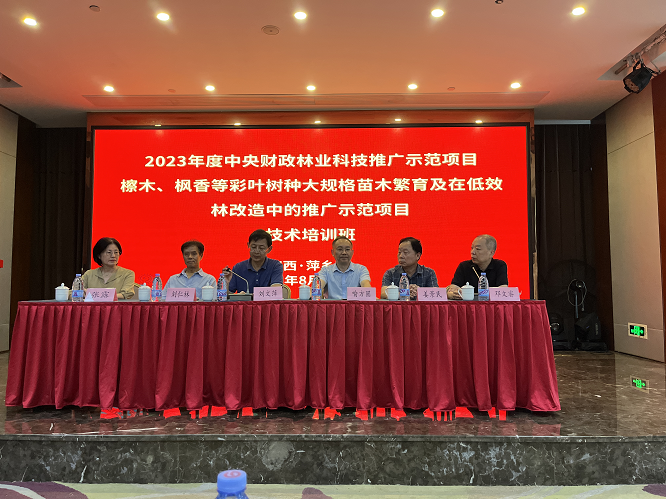 2023821-22日,由教工第一支部党员承担的2023年度中央财政林业科技推广示范项目“檫木、枫香等彩叶树种大规格苗木繁育在低效林改造中的推广示范”在江西萍乡举办技术培训班。林草局教学名师张露教授、萍乡市林业局党组成员刘文萍、项目合作单位萍乡市林科所邓文睿所长、潜伟平副所长、刘江华副所长、彭辉武主任及相关科研骨干,PA视讯集团官方网站教工第一支部党员易敏副教授、萍乡市各县(区)林业技术推广站、国有林场、涉林企业等专业技术人员120余人参加了培训。