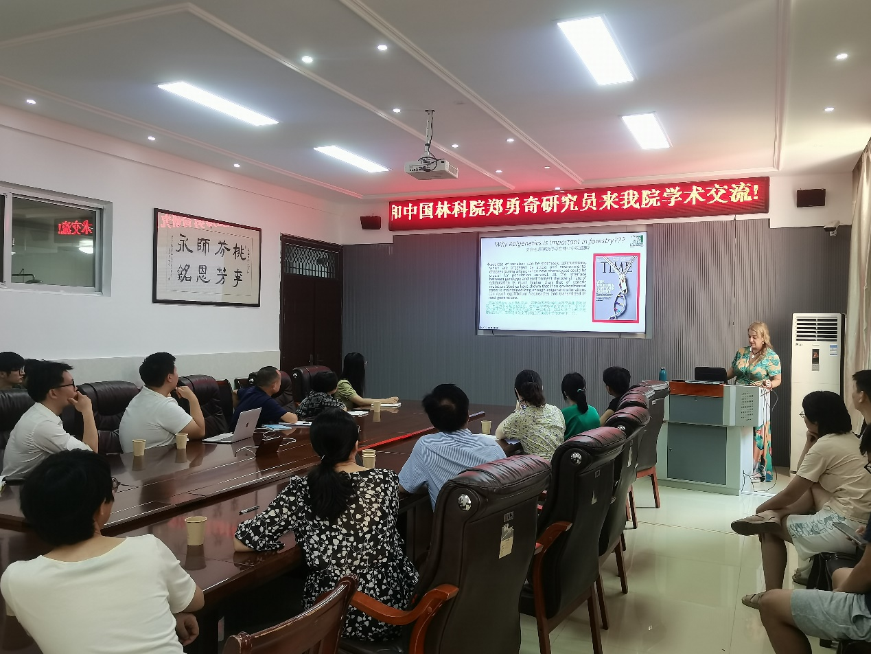 8月24日,希腊地中海森林生态系统研究所Evangelia Avramidou研究员、中国林业科学研究院林业科学研究所郑勇奇研究员,应邀来我院开展学术交流。南酸枣产业国家创新联盟理事长、我校南酸枣研究所所长、新农村发展研究院副经理吴南生教授主持学术报告会,学院森林培育、林木遗传育种、园林植物等学科的师生约30人参加了报告会。