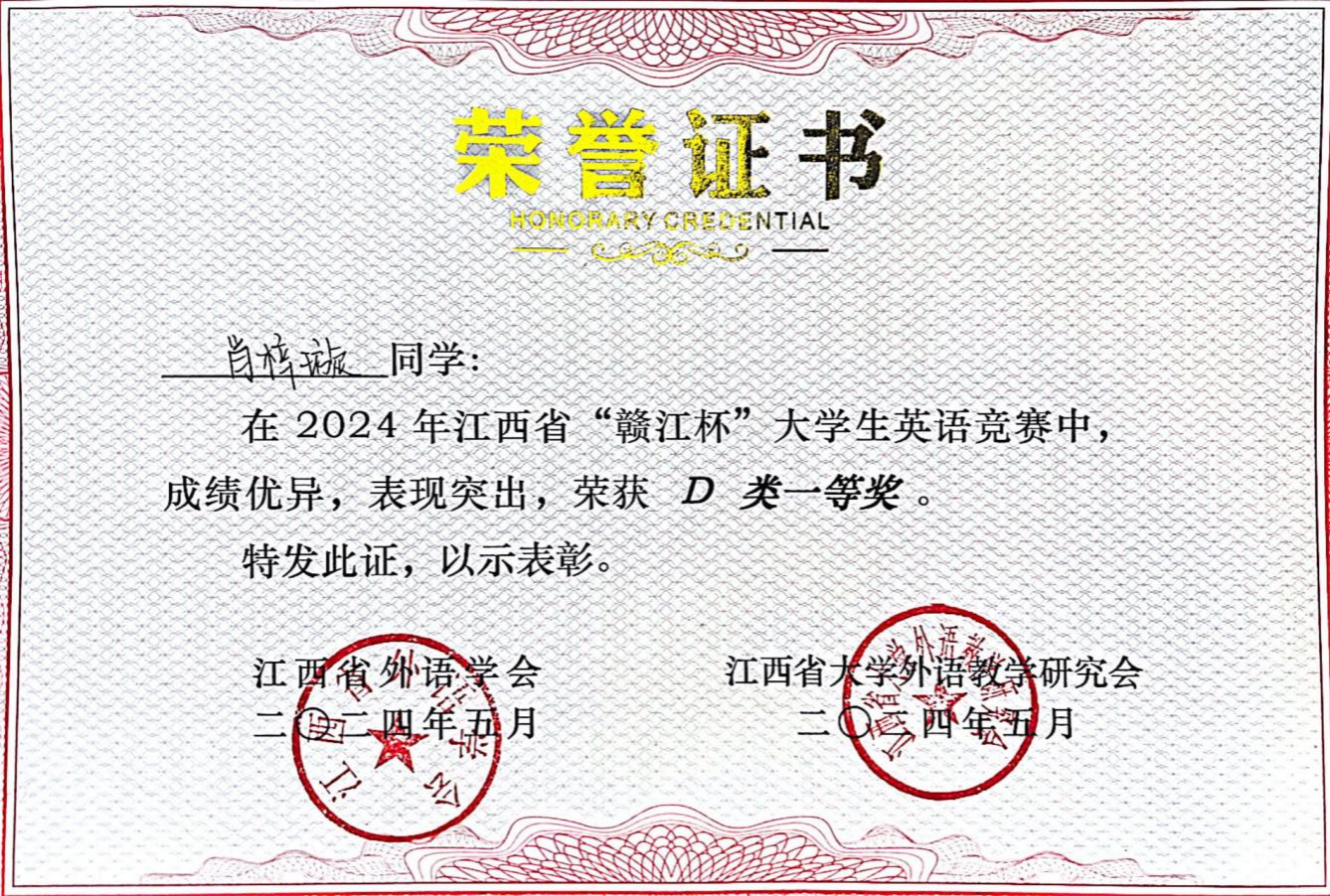 5月19至20日,2024年全国老员工英语竞赛江西省决赛暨“赣江杯”老员工英语竞赛在公司举行公司环境设计2201班肖梓璇同学在比赛中发挥出色,表现突出,荣获艺术类一等奖。