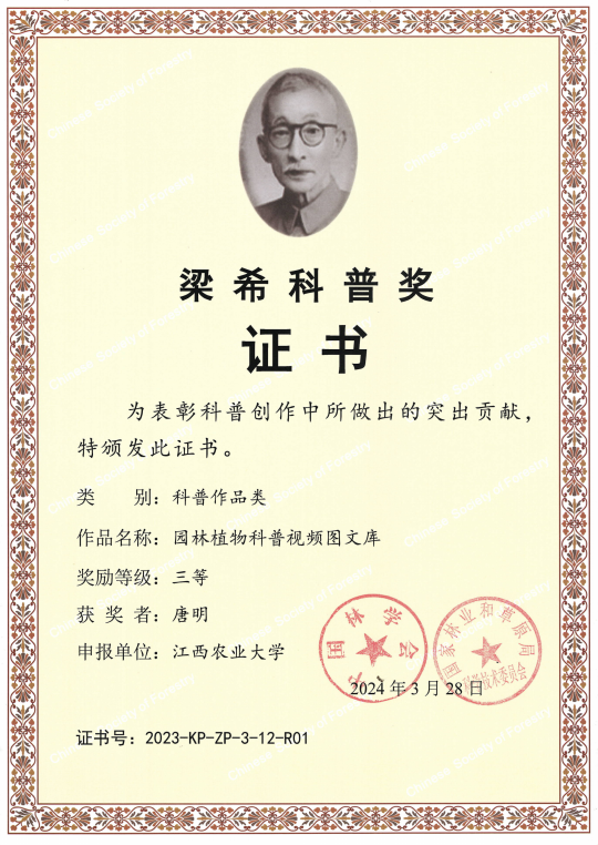 为表彰和奖励在林业和草原科普创作、科普活动等方面做出突出贡献的单位或个人,根据《梁希科普奖奖励办法》(试行),中国林学会于2023年8月启动了第十二届梁希科普奖评选工作。经形式审查、专家初评、第十二届梁希科普奖评审委员会评审和网上公示等程序,最终评选出获奖项目(人物)46项(名)。学院唐明博士申报的《园林植物科普视频图文库》系列科普短视频获科普作品类奖三等奖。