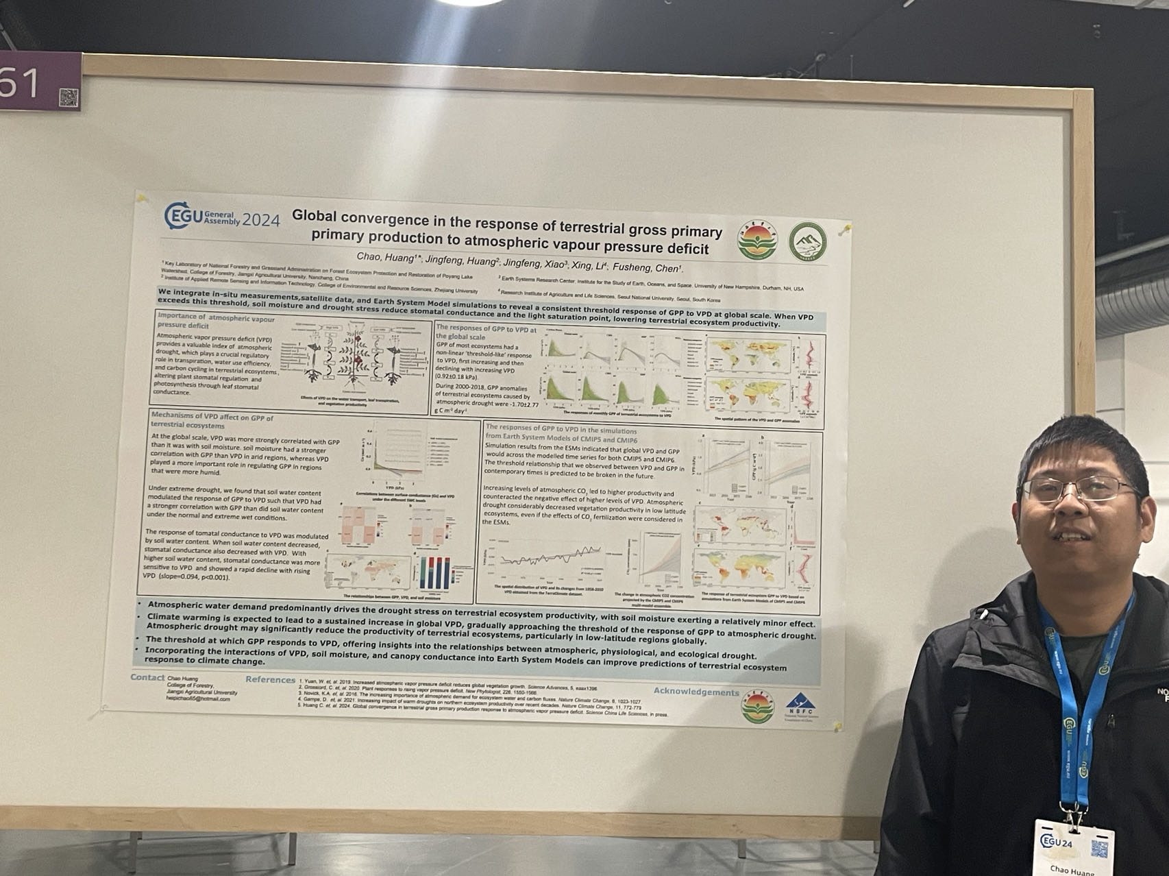 2024年4月13-19日,欧洲地球科学联合会(European Geosciences Union)在奥地利维也纳举办年度会议,来自113个国家的2余万名专家与学者参会。应欧洲地球科学联合会邀请,学院黄超副教授参加了会议,并在分会场“BG3.38--Impacts of heat and vapor pressure deficit on plants and ecosystems”做了题为“Global convergence in the response of terrestrial gross primary production to atmospheric vapour pressure deficit”的报告,介绍了对全球陆地生态系统总初级生产力对大气干旱响应的研究成果。该研究利用全球碳通量联网观测数据、叶绿素荧光遥感产品以及IPCC CMIP5和CMIP6地球气候系统模式模拟,系统探讨了这一问题。研究成果得到了苏黎世理工和瑞士联邦森林、雪与景观研究所的Charlotte Grossiord教授以及美国印第安纳大学的Kimberly A. Novick教授等领域知名学者的高度认可,并与苏黎世理工大学、美国加州大学伯克利分校和新罕布什尔大学等单位就极端干旱对陆地生态系统碳循环研究达成了合作意向。