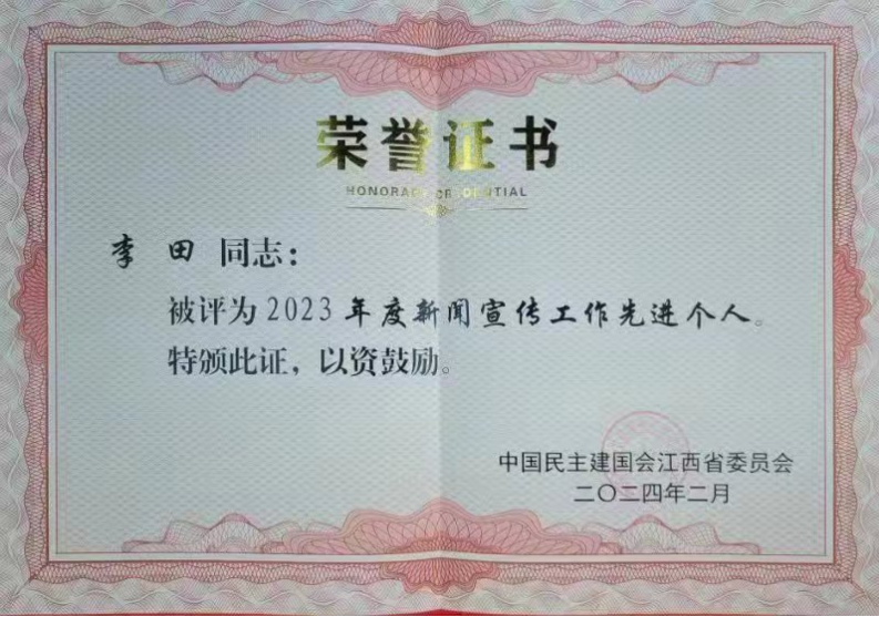 近日,民建江西省委员会召开2023年度表彰大会,学院李田副教授荣获2023年度新闻宣传工作先进个人称号,学校民建委员会仅1人获此殊荣。