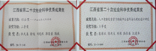近日,江西省第二十次社会科学优秀成果奖评审结果公布,公司杜天真教授主持完成的《彩云里-庐山生态文化寻迹》和张绿水副教授主持完成的《人口老龄化背景下的城市公园布局与规划设计研究》均荣获三等奖。