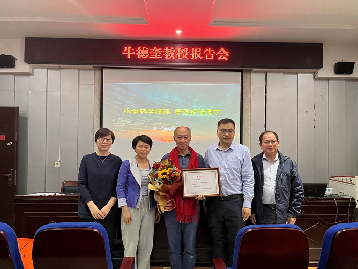 牛德奎教授以《不舍林学情怀,寄语护绿园丁》为题,从个人经历、林学情怀、体会感悟、寄语青年教师四个部分回顾了自己四十多年来学习工作经历,分享在教学、科研、社会服务等各方面的工作心得体会,勉励青年教师从扩大学科知识体系、夯实基础理论积淀、积累教学研究成果、关注国家发展要求等方面提升和要求自己,给予了青年教师殷切的期望。牛德奎教授爱岗敬业、教书育人、勤于专研,严谨治学,曾获全国水土保持先进科技工作者、江西省奉献水土保持事业终身荣誉奖等多项荣誉,为江西红土地的水土保持做出了突出贡献。
