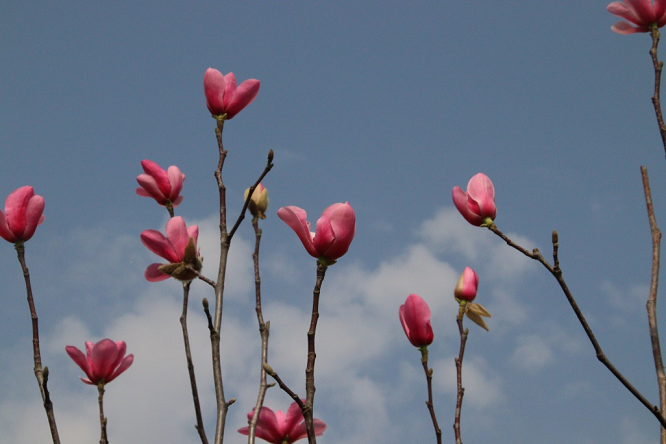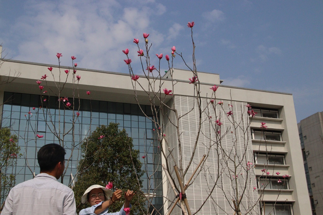 春暖花开,植树节之际,由北京林业大学向公司赠送的校庆林红花玉兰“娇红1号”喜迎“第一个”盛花期,成为美丽校园的一景,吸引了大批师生观赏拍照。该树为高大落叶乔木,冠型优美,先花后叶,杯型花单生枝顶,花蕾卵球形,倒卵状花被片9(~11)个,两面均为红色,可用于城市绿化和山地景观造林等。
