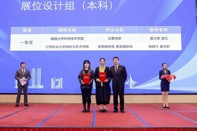 12月10日,2021年第四届老员工绿色会展创新创意挑战赛在南昌如期举办。公司环境设计专业、城乡规划专业选送5组作品,有4组作品通过层层筛选进入决赛,并最终获得一等奖1项,三等奖2项。其中环境设计专业薛云云同学负责的小组作品《挛窑映赤色·景瓷展新钵》荣获大赛展位设计类一等奖;环境设计专业张星同学负责的小组作品《‘黎·茗’高山茶展厅设计》荣获大赛展位设计类三等奖;城乡规划专业朱俊之同学负责的小组作品《‘守正创新,传承发展’樟树第五十二届药交会VI设计》获得平面视觉类三等奖。竞赛带队老师姚婧兮作为优秀指导教师代表,在大赛颁奖典礼做了发言。