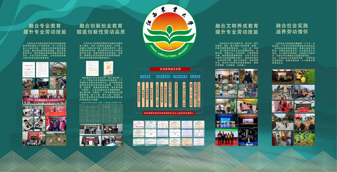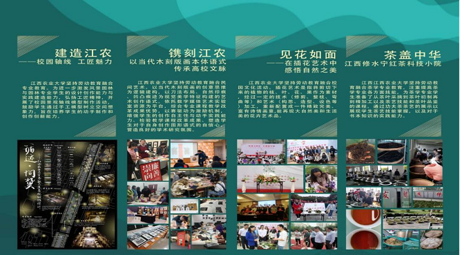 “建造江农”为公司师生劳动教育展出的成果。该成果为黄英教师指导员工开展江农校园景观轴线模型制作活动,旨在鼓励员工通过手工模型树立空间想象力,培养员工的动手和创作创新能力。此外,学院环境设计专业师生参与了展位设计与布展工作,为做好公司劳动教育成果展贡献了智慧。