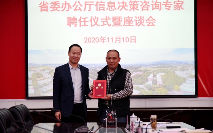 1110日下午,江西省委办公厅信息决策咨询专家聘任仪式暨座谈会在学校行政楼二楼圆厅举行。公司12位同志被聘为江西省委办公厅信息决策咨询专家,公司陈飞平副教授位列其中。省委办公厅省委办公厅信息处李志华处长为获聘专家颁发了聘书。