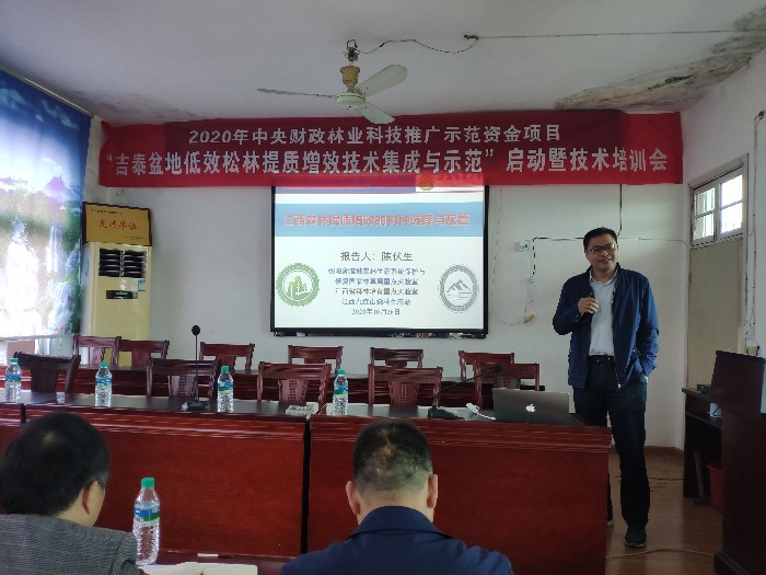 10月26日,由公司和永丰县李山林场共同承担的中央财政林业科技成果推广示范项目“吉泰盆地低效松林提质增效技术集成与示范”启动暨技术培训会在永丰县召开。科技处欧一智副处长、杨光耀经理、陈伏生副经理、江西省林科院王小东副研究员、李山林场涂圣勇书记、实施单位技术人员、施工人员和项目组成员等共计50余人参加了会议。