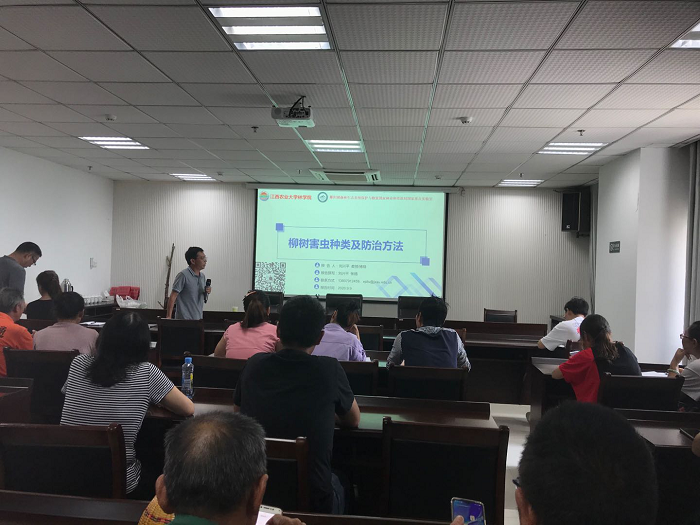 应抚州市园林绿化局(风景名胜管理局)邀请,公司吴南生教授、刘兴平教授、张扬博士于99日上午在抚州市城市园林绿地现场调研指导园林植物的病虫害防治,并在市局会议室举行了技术培训刘兴平教授、张扬博士分别就城市园林树种柳树的虫害和病害种类、发生规律及防治技术进行了讲解,市园林绿化局生产单位人员全程参与了培训。