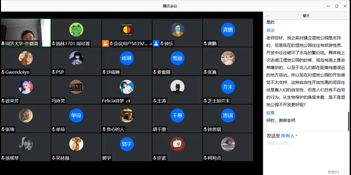 随后的11天里,校内外老师立足于自身研究领域和游学实践经历,给同学们带来了精彩纷呈的全球景观之旅。讲座主题横跨乡村旅游景观、国家公园、欧洲与日本园林、古典园林山水艺术、景观声景之美、自然山野探索、江浙沪园林等多个领域。每天主题报告后的互动环节中,同学们均积极通过多种形式进行提问和讨论。随着主讲老师的耐心解答,同学们景观视野得到了不断拓展;热烈的讨论过后,则是同学们对景观认识的逐渐成熟。同学们纷纷反映整个云实习过程轻松而愉快,却洋溢着浓郁的学术交流和思辨氛围。云实习结束日,罗譞老师对本次云实习进行了总结,并对来年的实习表达了期待。