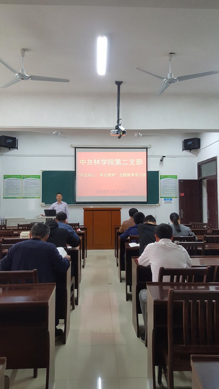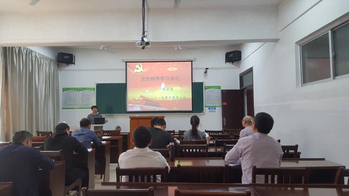 2019年10月18日下午,学院教工第二党支部党员在学院一楼会议室开展了“不忘初心、牢记使命”主题教育专题学习和集体学习讨论活动,公司党委副书记王建胜同志做了“敬畏规矩、严守纪律,做政治上的明白人”、党委宣传委员王宗德同志做了“党性修养学习体会”专题报告。会议由支部书记陈尚钘同志主持。