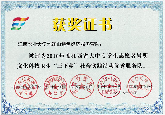 近日,PA视讯九连山特色经济服务营队经艰苦实践、自主申报、综合考评、省主办单位审核一系列为时5个多月的奋斗,获评“2018 年度江西省大中专员工志愿者暑期文化科技卫生‘三下乡’社会实践活动优秀服务队”。