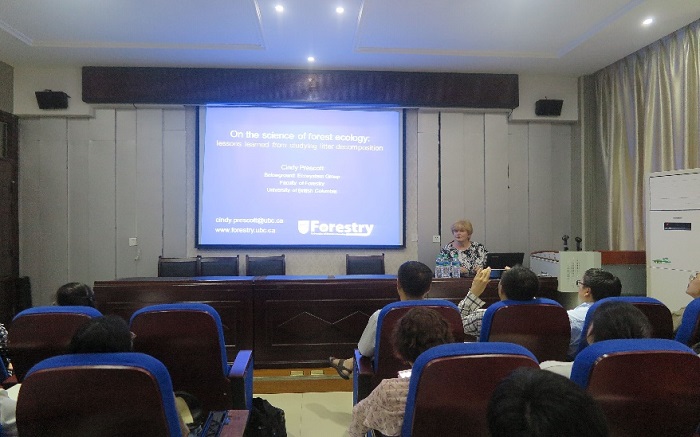 Prescott教授作了题为On the science of forest ecology: lessons learned from studying litter decomposition的学术报告,以凋落物分解研究为案例,介绍如何更好地开展森林生态学方面的研究。Martin教授作了题为Tips for publishing your research的报告,以其担任SCI期刊主编的视角,讲解了科研论文写作和发表的注意事项。