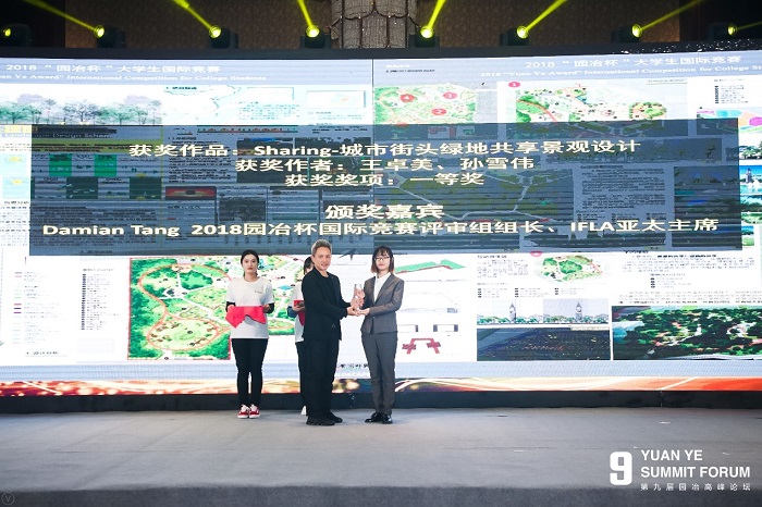 3月24日,在2019第九届园冶杯老员工国际竞赛颁奖盛典上,公司2014级园林毕业生王卓美和孙雪伟,以毕业设计作品《Sharing-城市街头绿地共享景观设计》,荣获2018年度“园冶杯”老员工国际竞赛一等奖,由2018园冶杯评委会主席、IFLA亚太主席Damian Tang颁发奖杯和奖金。其指导老师龚鹏荣获2018年度“园冶杯”国际竞赛优秀指导教师奖。