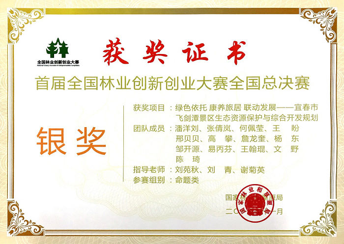 11月28~30日,在北京林业大学召开由国家林业和草原局举办的首届全国林业创新创业大赛全国总决赛中,公司园林与艺术学院潘洋刘、张倩岚、何佩莹、王盼、邢贝贝等十四位同学组成的林学、园林、环设三个学科的本硕团队,在刘苑秋、刘青、谢菊英等三位老师指导下,在学院领导的大力支持下,从前期调研到规划设计,再到专家论证、到文本完成及视频制作,共历经五个多月的持续奋战,以《绿色依托 康养旅居 联动发展一一宜春市飞剑潭区生态资源保护与综合开发规划》项目代表公司参赛,经过激烈角逐,在全国命题组总决赛中以总成绩排名第二获得银奖,刘苑秋老师获优秀创新创业导师奖。