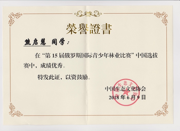 近日,由中国生态文化协会和国家林业和草原局对外合作项目中心联合主办的第15届国际青少年林业比赛中国选拔赛在北京落下帷幕。公司2015级林学实验班员工熊启慧、刘虹冰,在陈伏生教授、张露教授、卜文圣博士的指导下,经过资格审查、视频面试、英文演讲、现场答辩等环节,熊启慧同学脱颖而出,成功晋级最终的6人决赛名单,并取得优秀成绩。这是公司首次选派代表参赛,并得到组办方的高度评价。