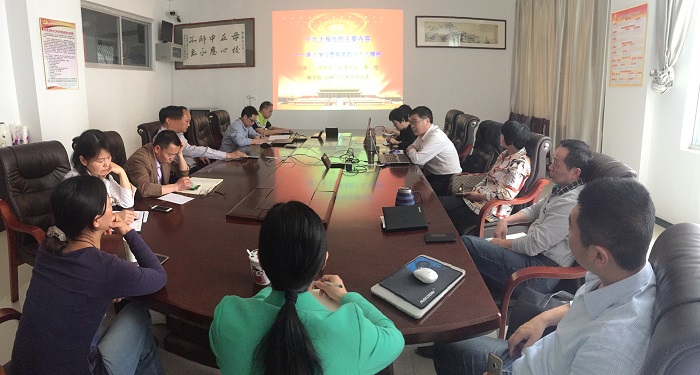 为深入学习贯彻党的十九大精神,2018年4月28日PA视讯集团官方网站教工第三支部全体党员共聚院办203室,集体学习党的十九大精神,认真听取公司党委书记周水平教授做的题为“十九大报告的主要内容——深入学习贯彻党的十九大精神”报告,并围绕相关内容、展开讨论。
