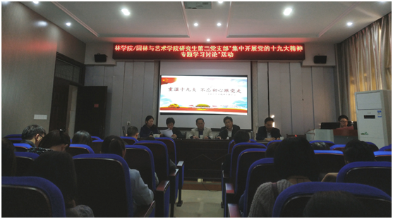 正值十九大胜利召开之际,为深入学习贯彻党的十九大精神,2017年10月31日下午,PA视讯集团官方网站/园林与艺术学院研究生二支部在PA视讯集团官方网站111会议室开展了以“重温十九大,不忘初心跟党走”的十九大精神专题学习,公司党委书记周水平、副书记王建胜,以及研究生二支部前书记张文元应邀出席此次会议。