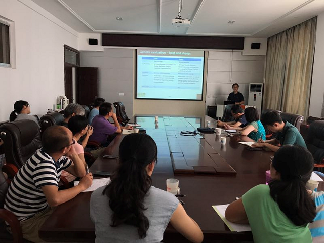 李力博士自2005年起在澳大利亚一直从事动植物遗传育种评估系统的研发,特别关注林木育种值评估系统的升级(TREEPLAN Version 2和3)和猪的育种值评估系统的升级。此次报告中,李力博士就“澳大利亚动植物育种值评估系统的研究进展”为题,介绍了澳大利亚的畜牧养殖业的发展,并详细讲述了育种值评估系统的研发过程、研究进展及其在生产实践中的应用。目前澳大利亚就牛、羊、猪和林木等研发了四类不同类型的育种值评估软件。最后,重点介绍了育种值与分子标记SNP技术相结合的分析方法,并现场演示育种评估软件PIGBLUP的操作与应用。报告结束后,李力研究员与师生们进行深入讨论交流,取得了良好的效果。