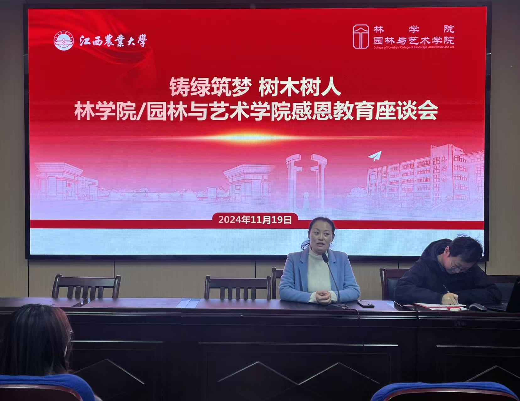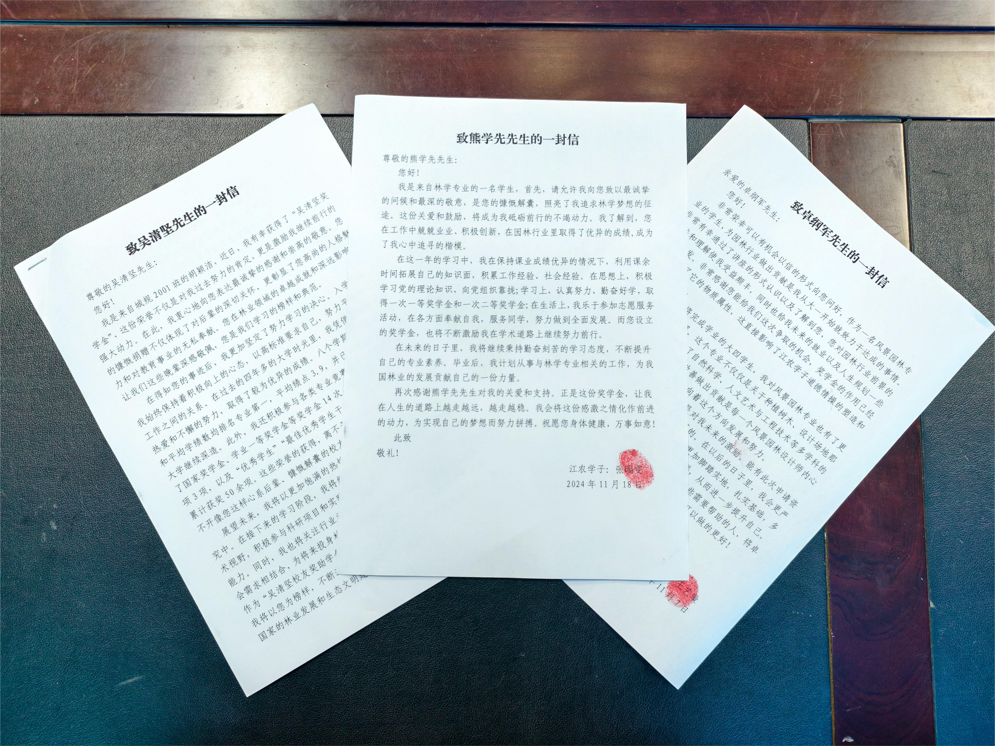 颁奖仪式结束后,园林与艺术学院组织召开“铸绿筑梦 树木树人”感恩教育座谈会,会上,大家纷纷表示要常怀感恩之心,保持谦虚谨慎,用自己的实际行动传递爱与温暖。会后,获奖员工在信中畅谈了自己的学习心得、成长经历以及对未来的展望,字里行间流露出对捐助人的深深敬意和感激之情。