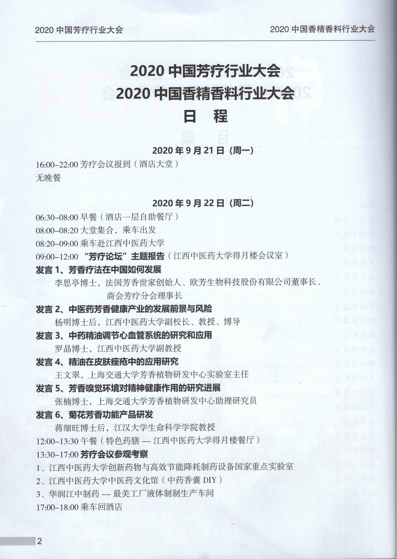 由中国食品土畜进出口商会芳疗分会、香精香料分会主办2020中国芳疗行业大会、2020中国香精香料行业大会将于921-24日在南昌召开。这是全国芳疗行业和香精香料行业研究者、生产者、应用者交流研讨的盛会,欢迎相关人员和研究生参会。