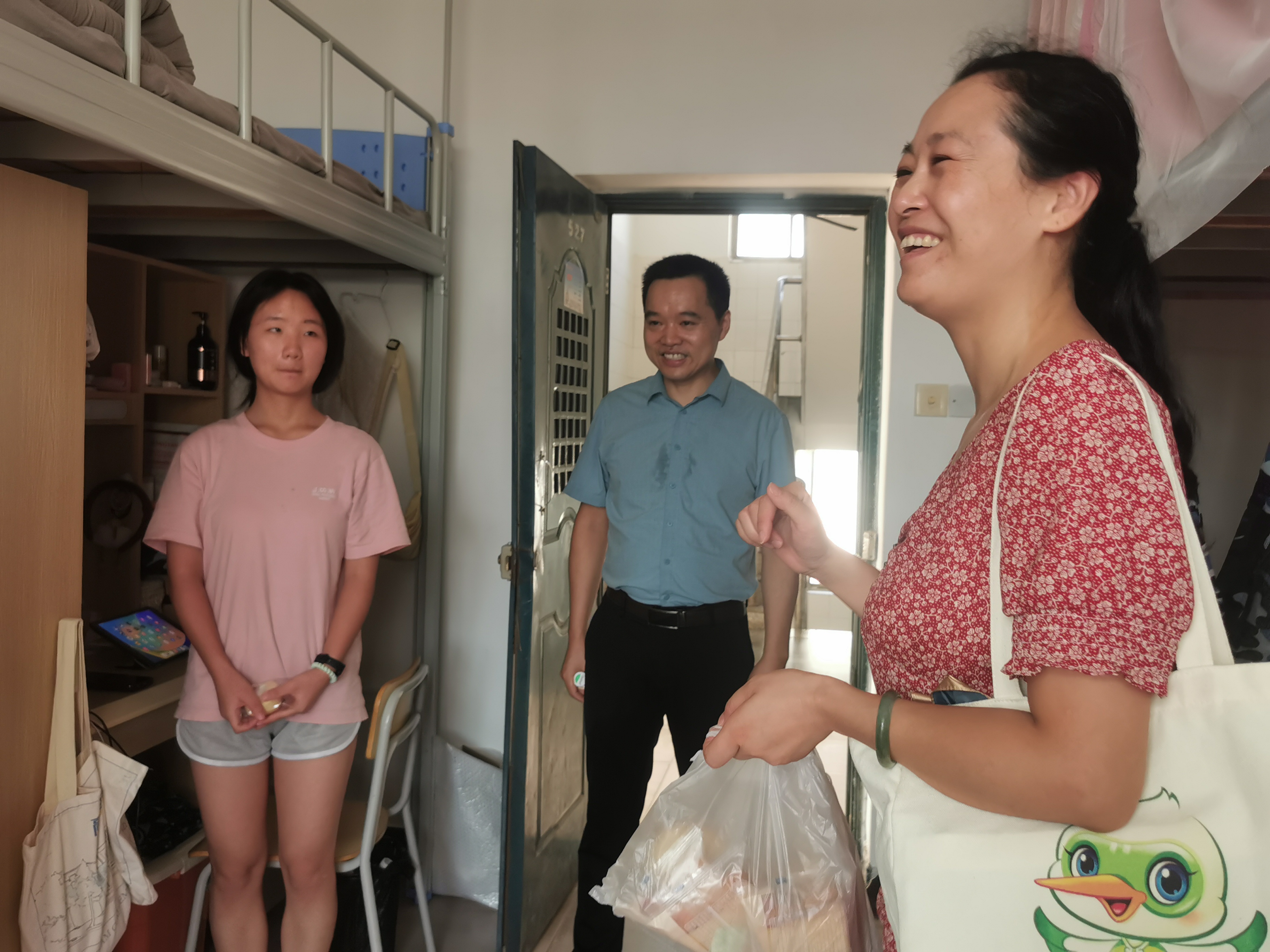 在大一新生宿舍,院领导、老师亲切地与同学们交谈,详细了解同学们的学习生活近况,希望同学们尽快调整状态,适应新的身份和校园环境,以积极饱满的精神状态去迎接老员工活。在高年级员工宿舍,院领导、老师勉励大家要珍惜在校时间,提前做好规划,不断提高自己的专业能力和综合素质。走访慰问期间,学院还给留校员工准备了小礼物,让求学在外的学子在中秋团圆的日子里感受到来自学院的温暖与关怀。