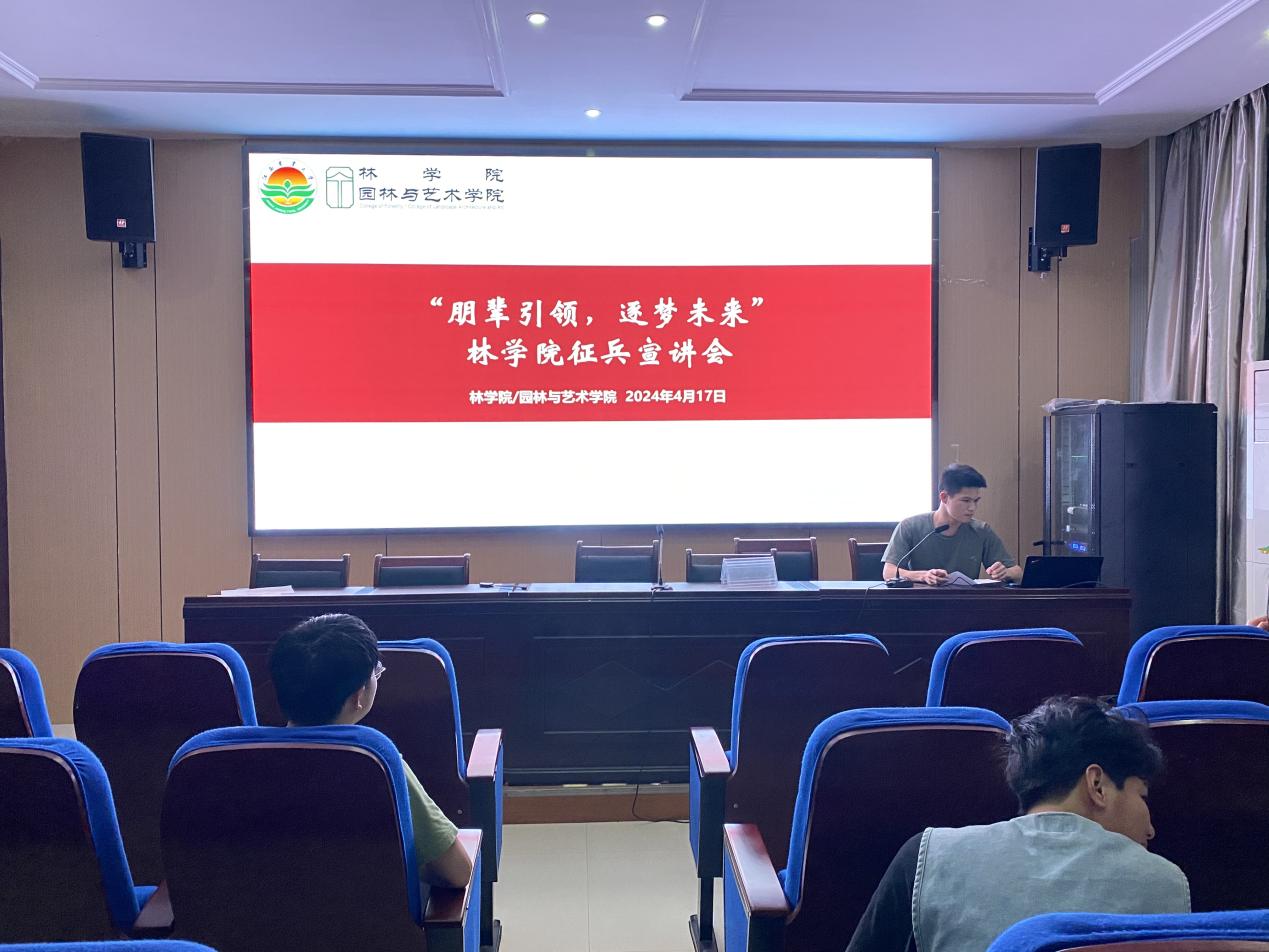 为增强员工爱国情怀,进一步做好公司员工应征入伍宣传和国防教育工作,2024年4月17日晚,公司邀请2022级林学专业的郭子伊同学与风景园林硕士研究生陈健龙同学于学院111会议室开展以“朋辈引领,逐梦未来”为主题的应征入伍宣讲会。