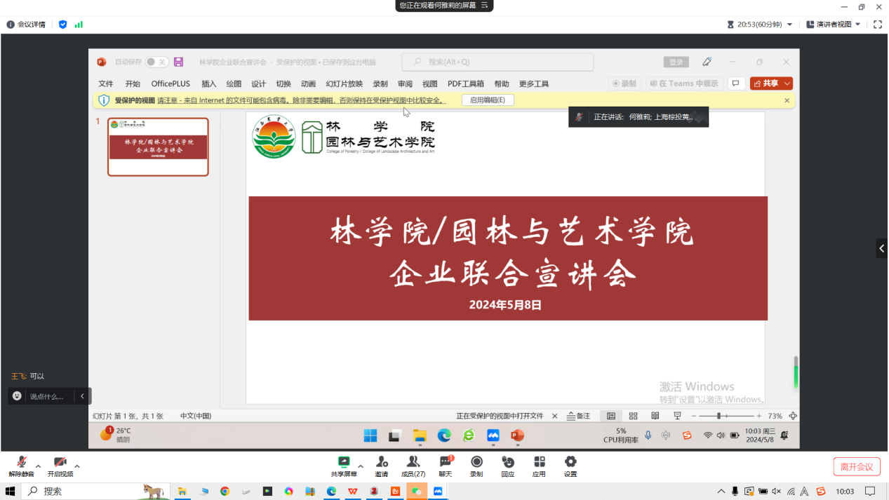 本次宣讲会邀请了江西全至设计咨询有限公司、上海棕投园林工程有限公司、广州智源农业科技发展有限公司与中国平安财产保险股份有限公司广东分公司四家业内知名企业进行招聘宣讲。在本次招聘会中,各企业对企业文化、岗位需求、薪资待遇等有关情况进行介绍,毕业生对有意向企业就相关情况积极提问。