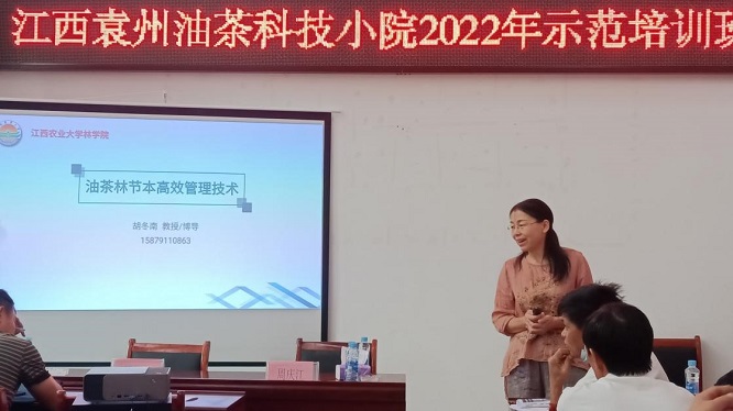 为充分发挥科技小院在乡村振兴战略中的重要作用,助力袁州油茶高质量发展,江西袁州油茶科技小院2022年示范培训活动于921-22日在江西星火农林科技发展有限公司举行,公司胡冬南教授莅临授课,来自袁州区西村镇、竹亭镇等六个乡镇共六十余名种植大户参加培训和现场学技。示范培训活动中,胡冬南教授介绍了油茶林节本高效管理关键技术,对油茶林地施肥管理、杂草管理、科学修剪等内容进行了详细的讲解,并和学员对进行交流和互动。